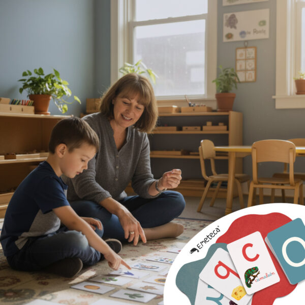 Este set de 27 tarjetas didácticas Montessori está diseñado para acompañar a los niños en sus primeros pasos en la lectoescritura.