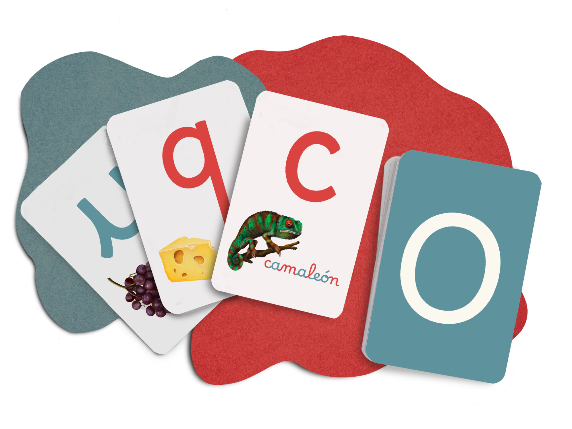 El reverso incluye la letra correspondiente en mayúscula, con un código de color (rojo para consonantes y azul para vocales) que estimula el reconocimiento visual y la clasificación.