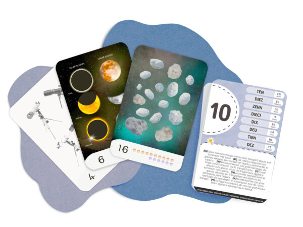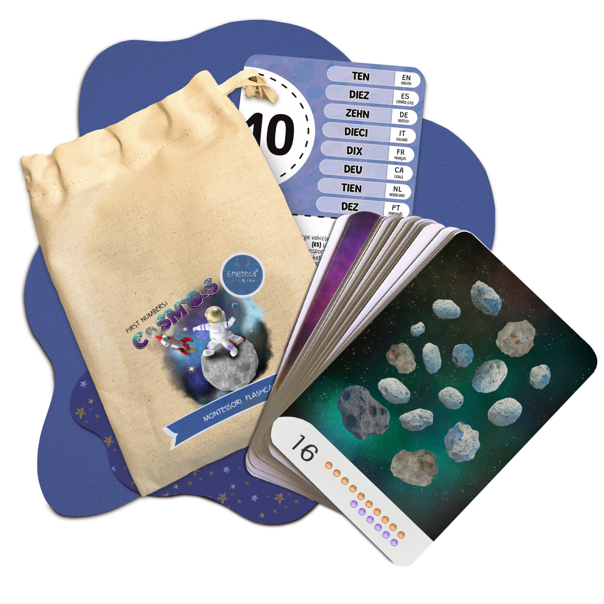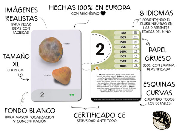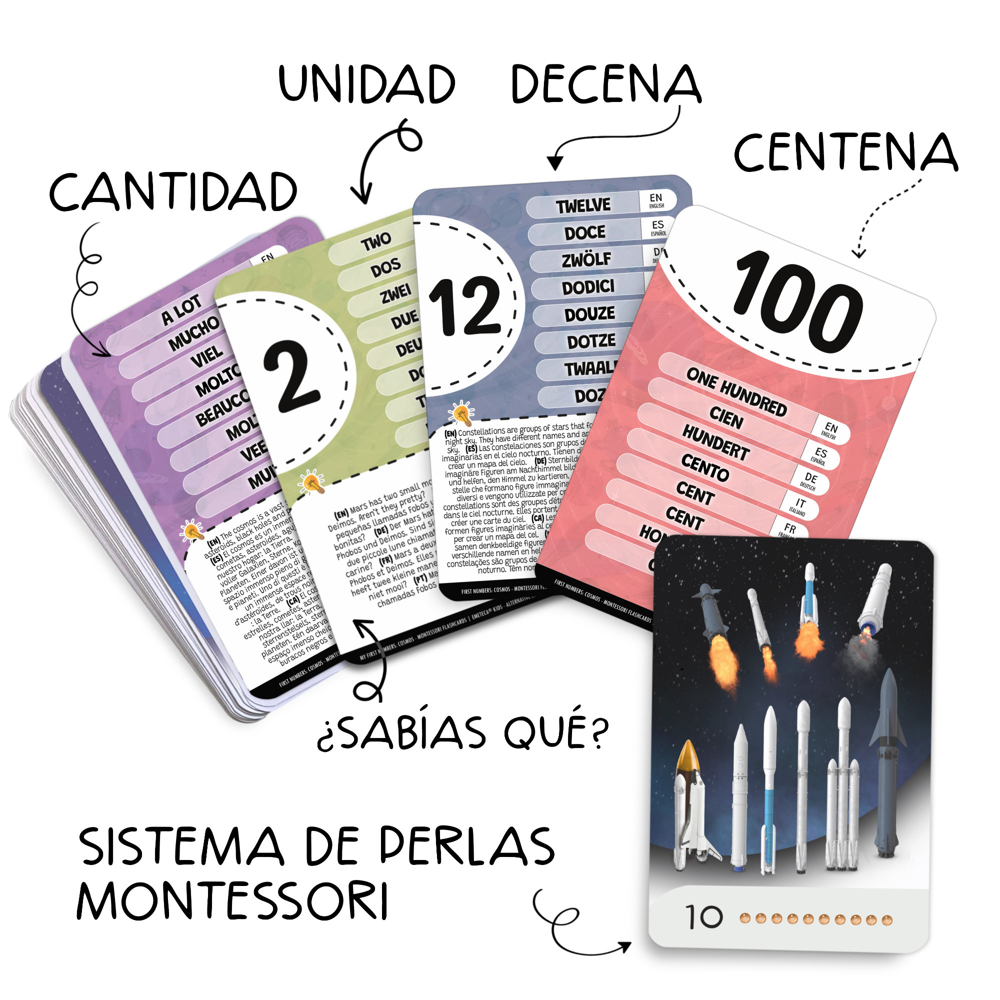 Set de tarjetas Montessori para aprender los primeros números, con ilustraciones realistas del Cosmos. Creadas para estimular la observación y el pensamiento lógico con un enfoque multilingüe.