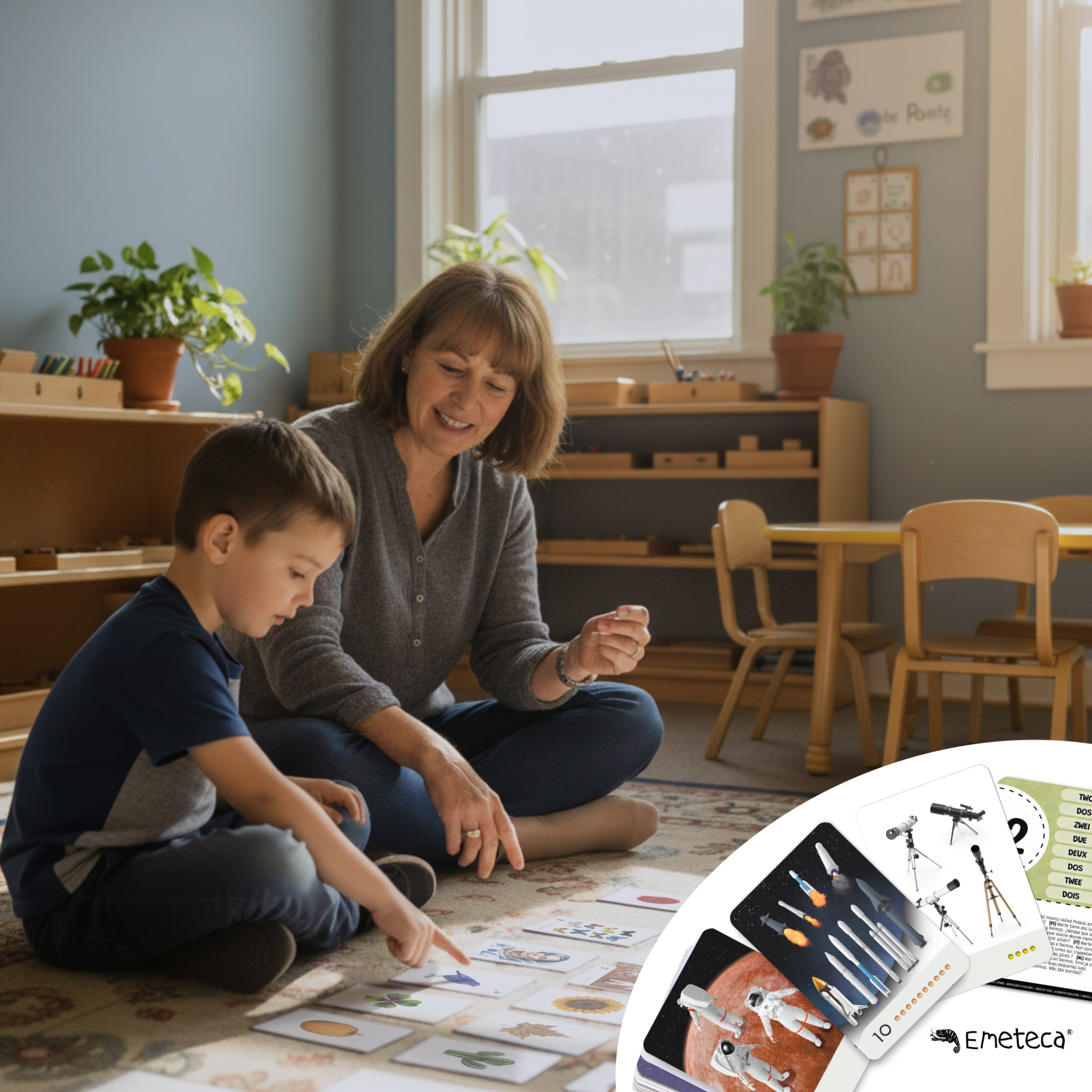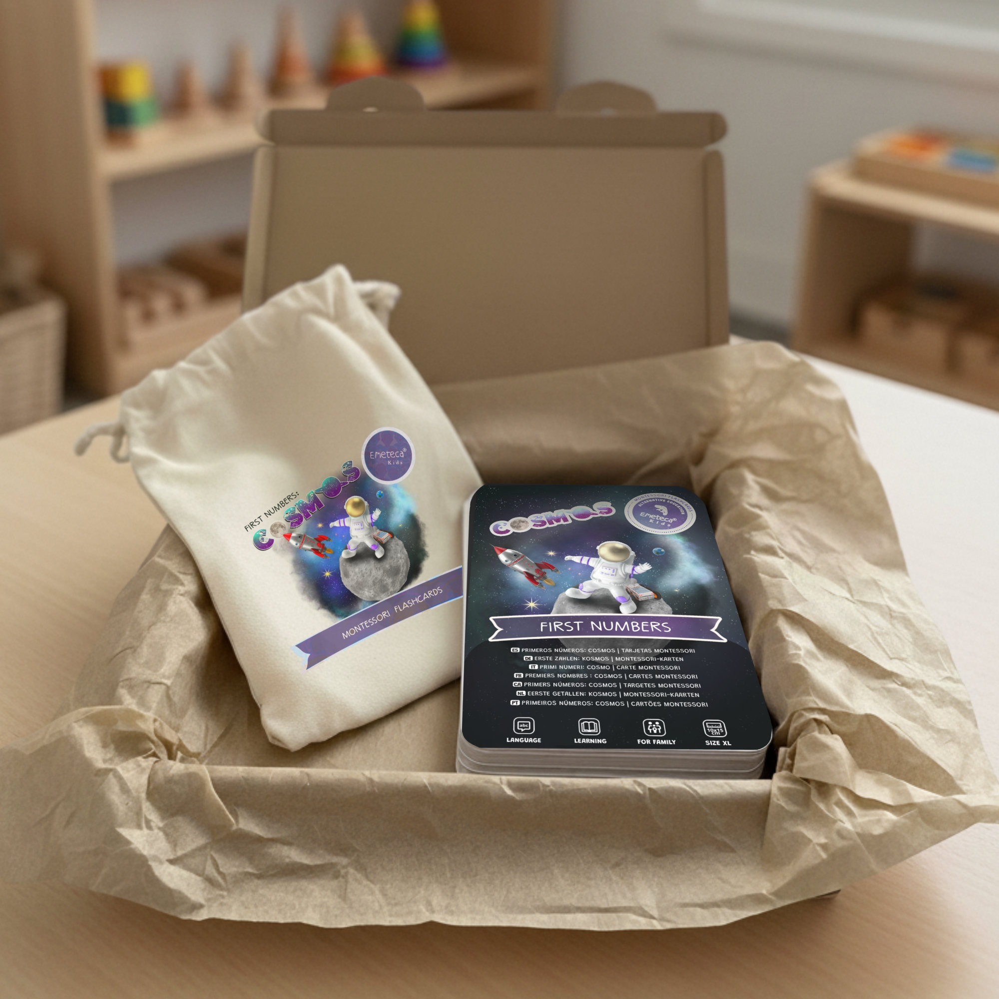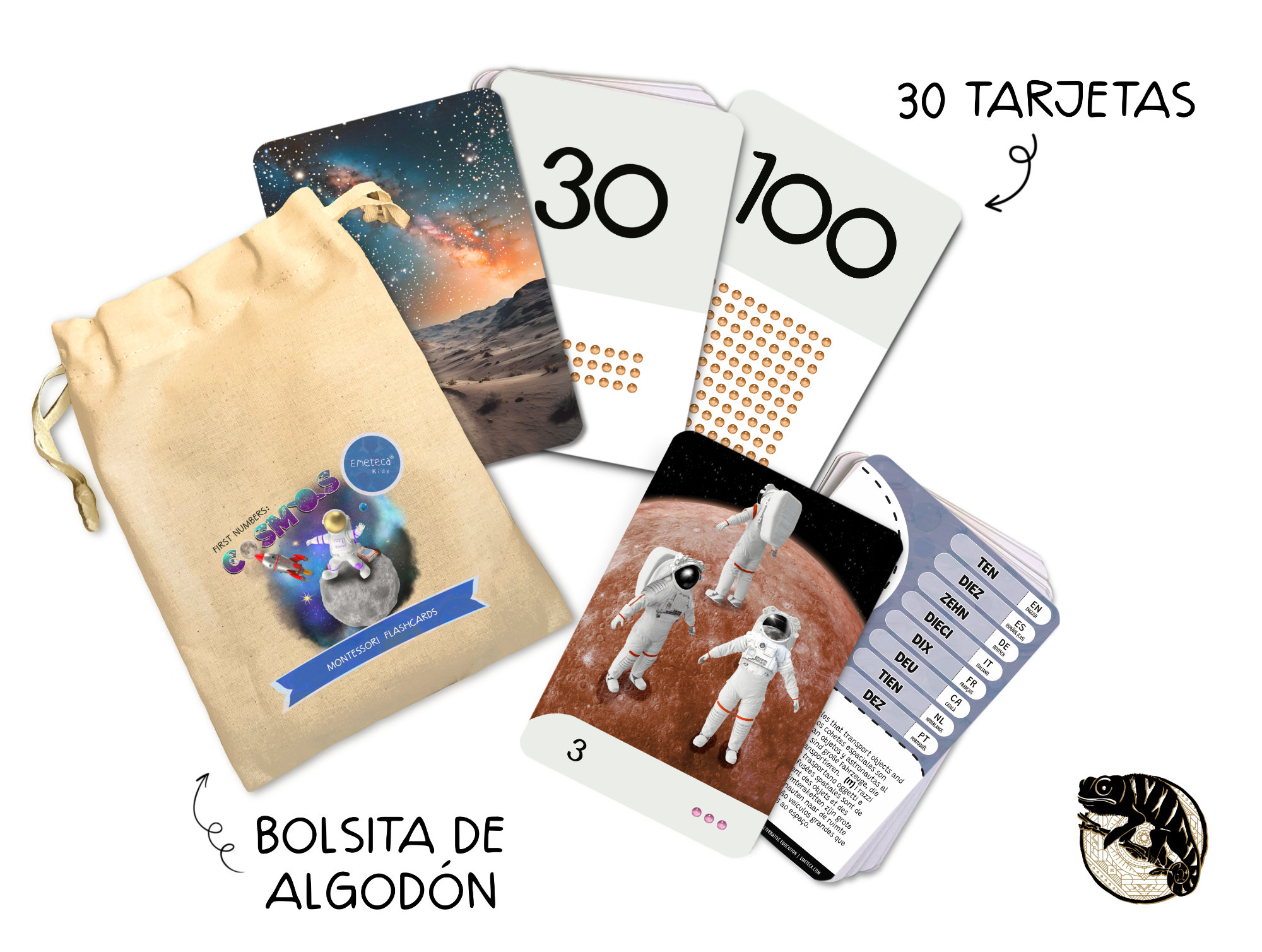 Set de tarjetas Montessori para aprender los primeros números, con ilustraciones realistas del Cosmos. Creadas para estimular la observación y el pensamiento lógico con un enfoque multilingüe.