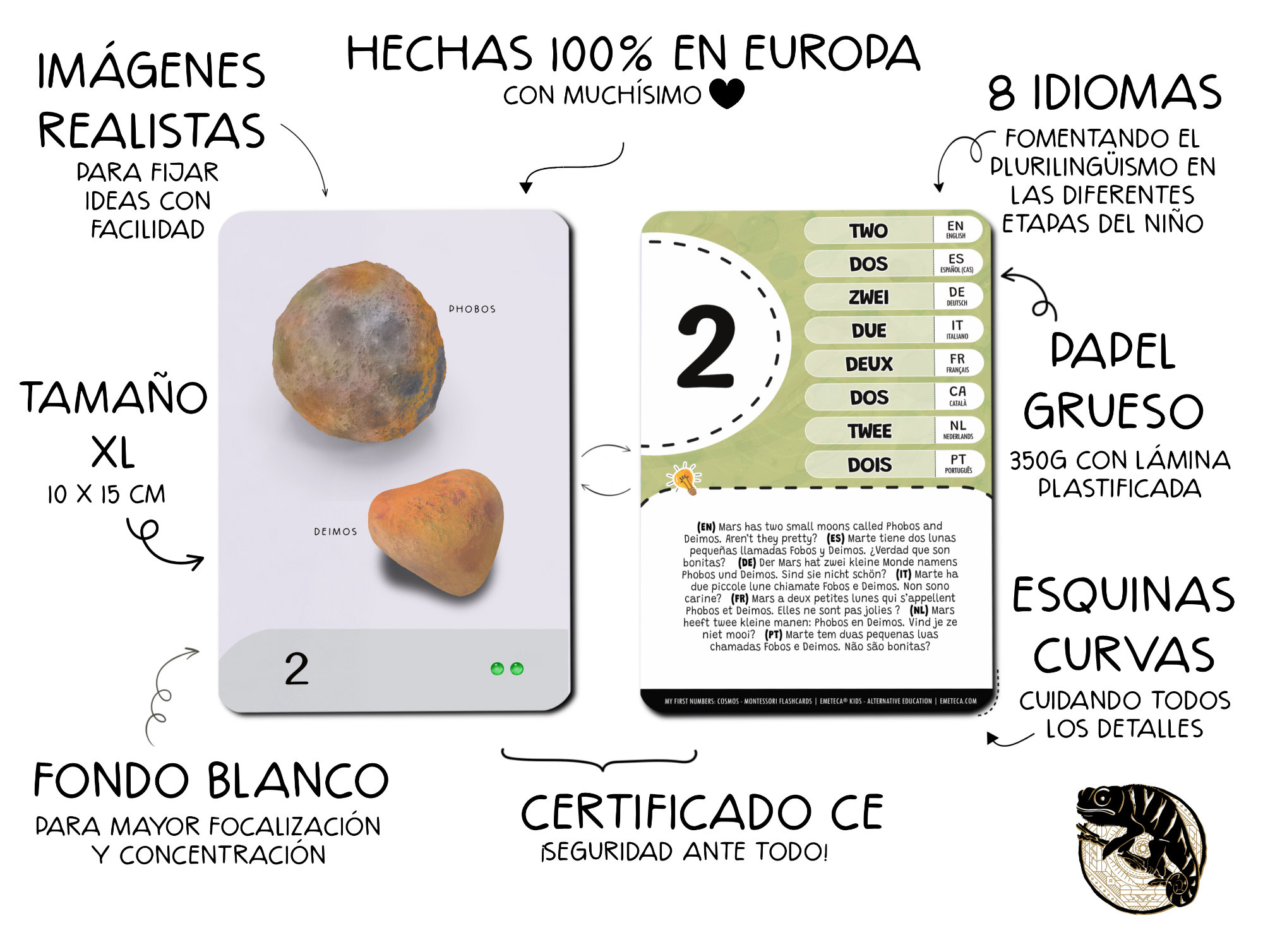 Incluyen el nombre del número y una breve curiosidad en castellano, inglés, francés, alemán, italiano, catalán, portugués y neerlandés, para una primera aproximación al aprendizaje plurilingüe.