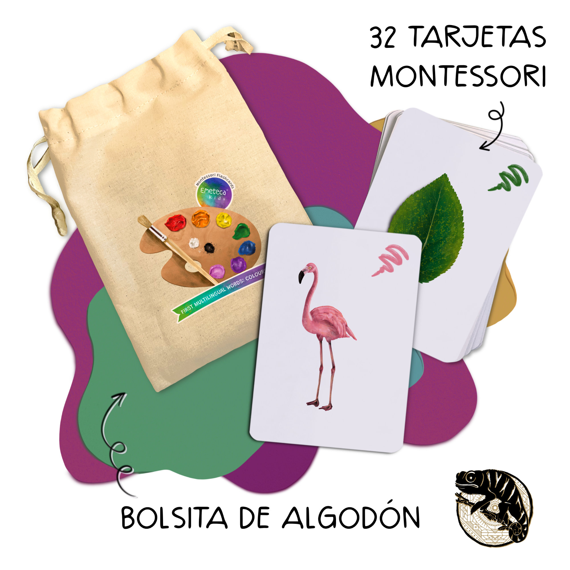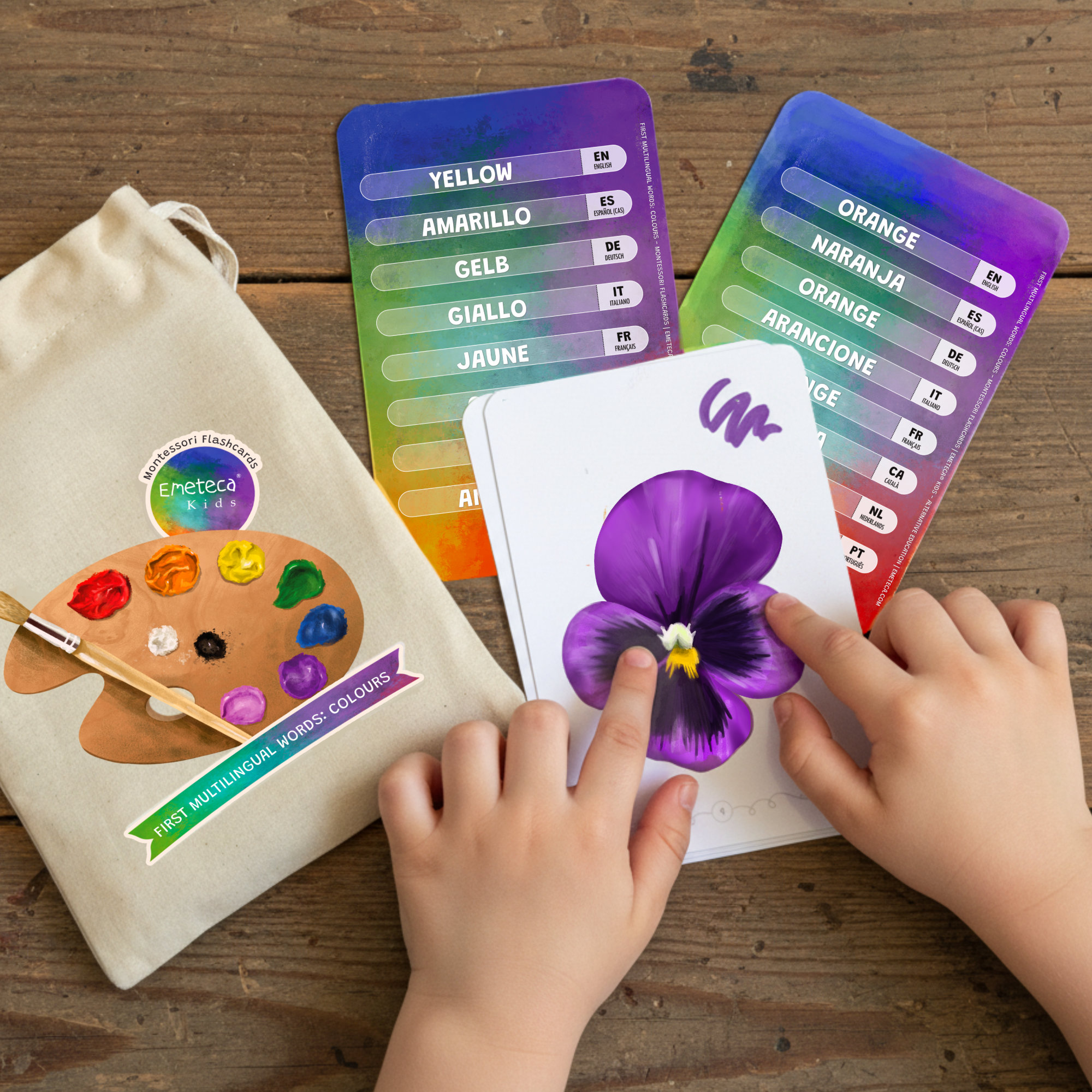 Tarjetas Montessori de los Colores · Colección Primeras palabras multilingües · Emeteca® Kids.