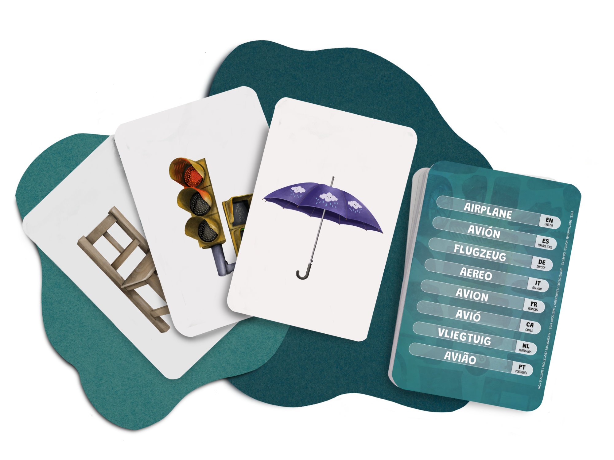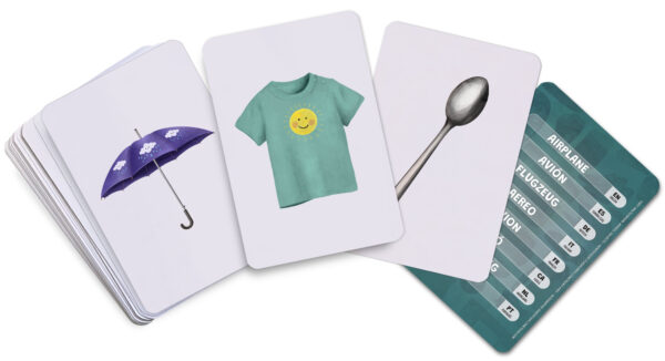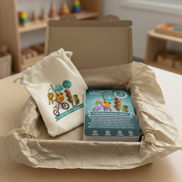 Set de tarjetas Montessori en 8 idiomas para aprender vocabulario, con ilustraciones realistas de objetos cotidianos. Aptas para las distintas etapas de la infancia gracias a su enfoque multilingüe.