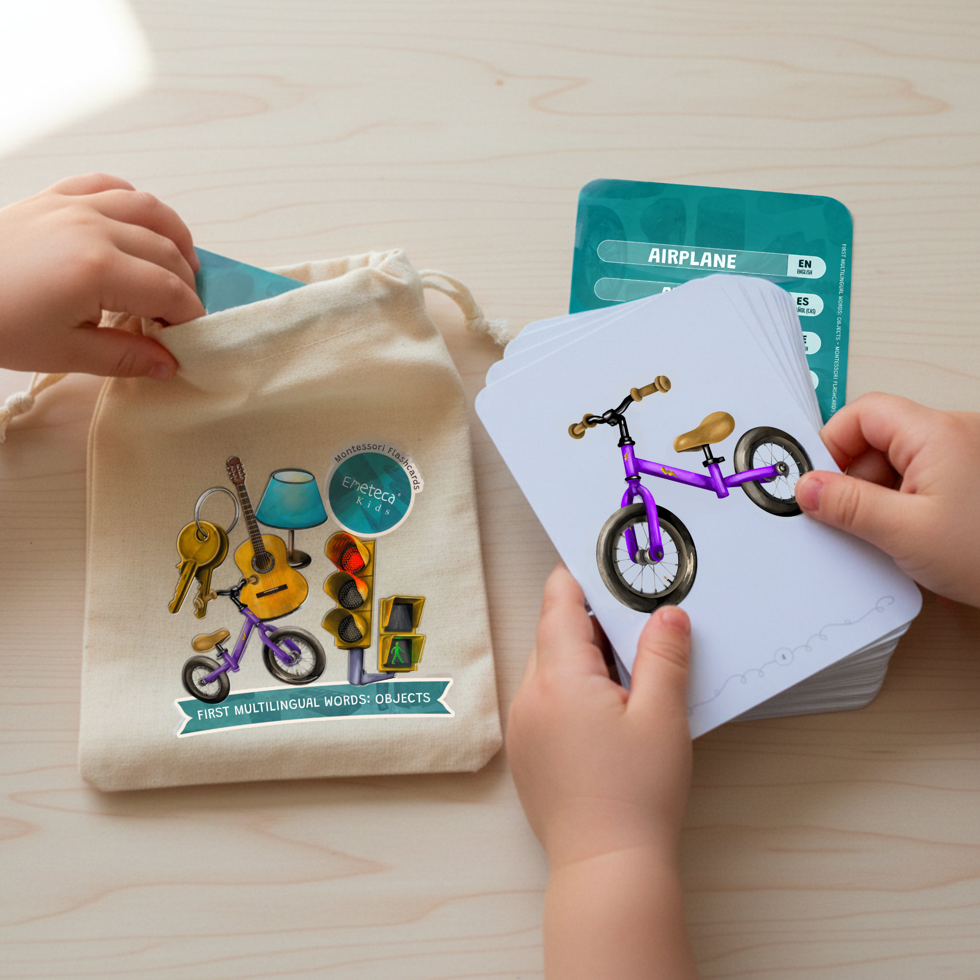 Este set de 32 tarjetas didácticas Montessori invita a los niños a descubrir el universo de los objetos cotidianos a través de imágenes realistas y vocabulario en ocho idiomas.